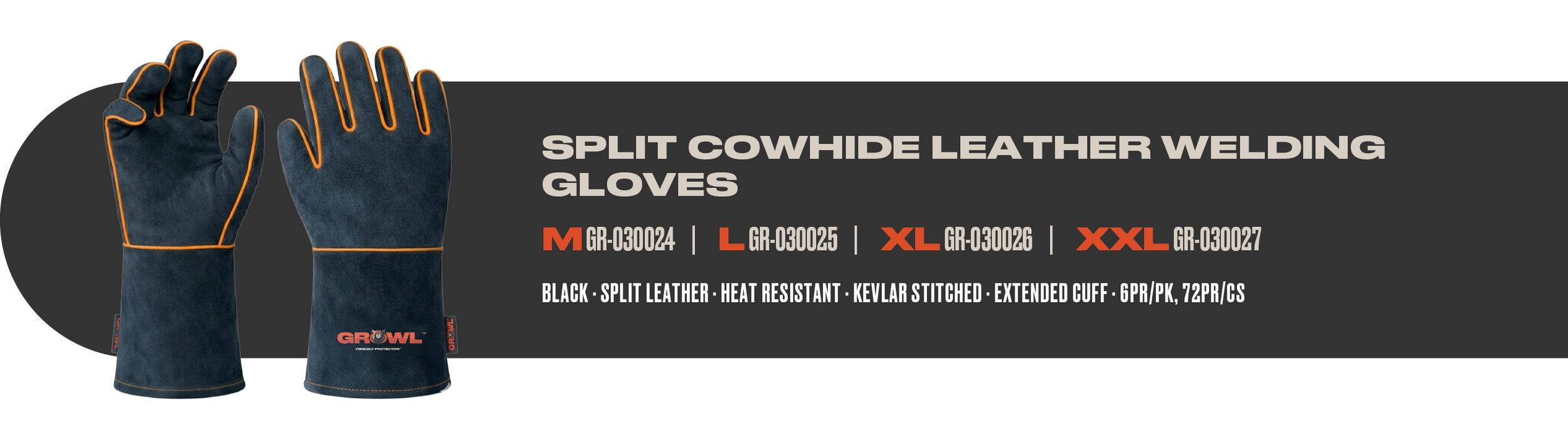 Split cowhide leather construction — durable and heat-resistant for demanding welding environments.