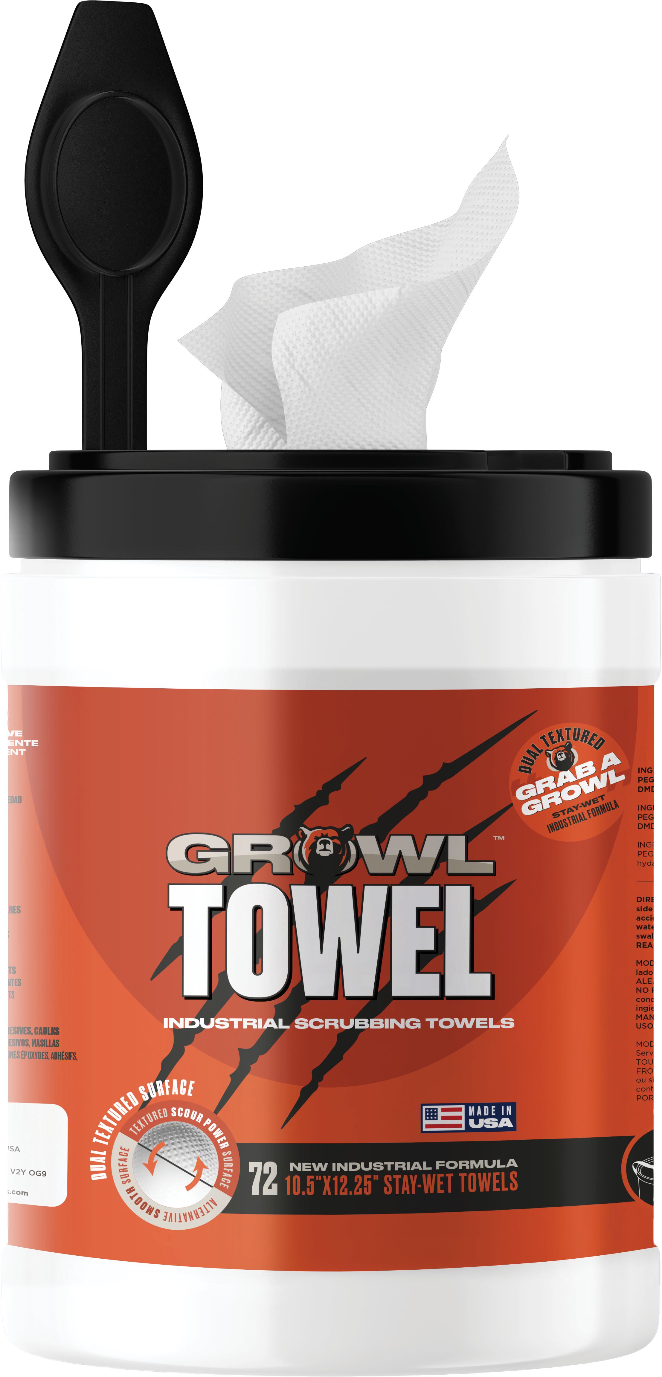 GROWL TOWELS are made of a durable, textured material pre-moistened with our heavy duty cleaning solution — great for cleaning tough soils, dirt and grime.